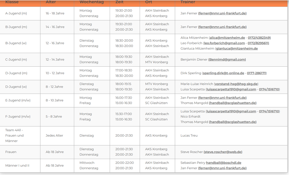 Trainingszeiten HSG Steinbach/Kronberg/Glashütten